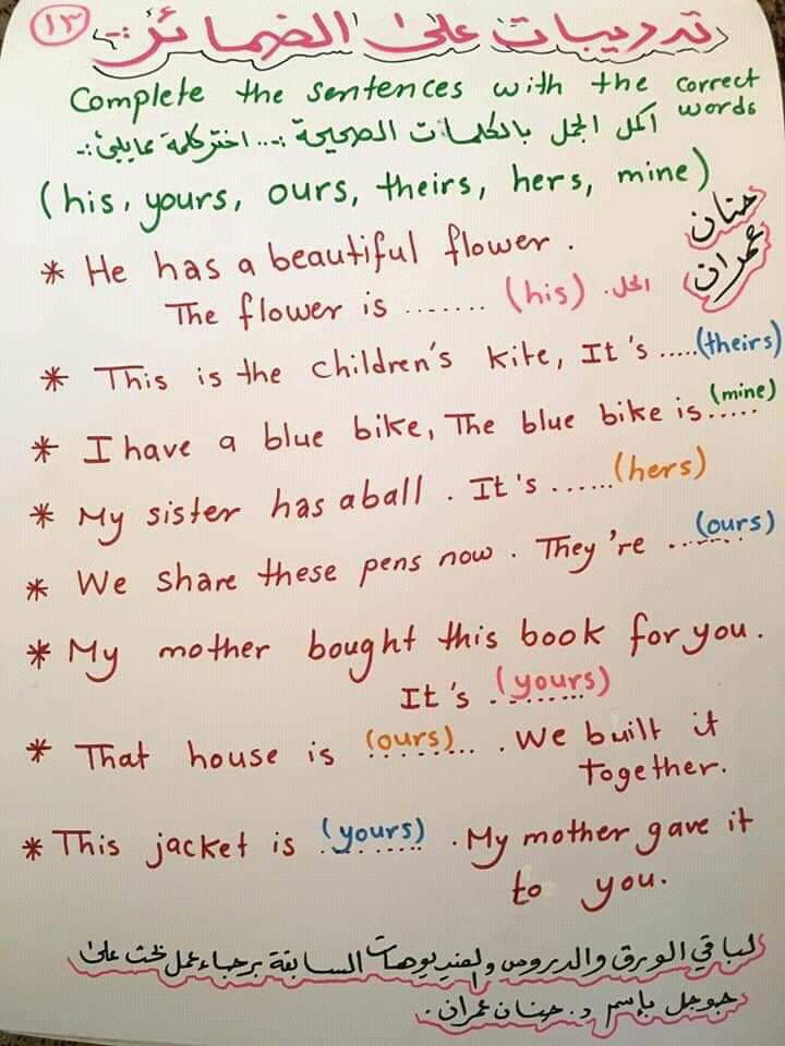 تمارين على صفات الملكية الصورة الأولى Program For Learning English Facebook